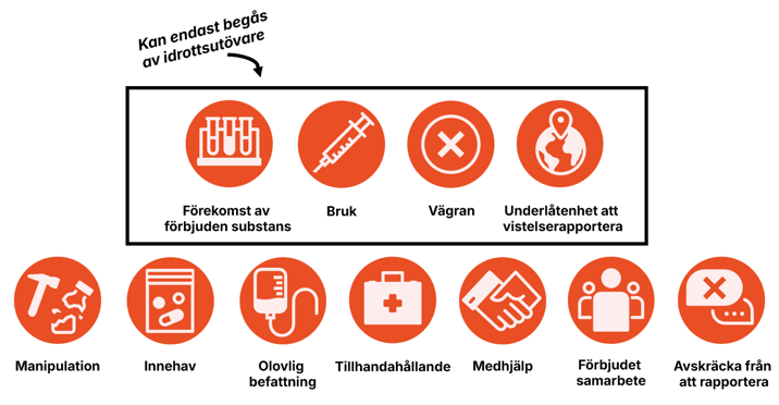 Här nedan finns de alla beskrivna med exempel samt avstängningstid för respektive förseelse. För mer detaljerade beskrivningar finns Idrottens Antidopingreglemente och bilagan för definitioner att läsa.